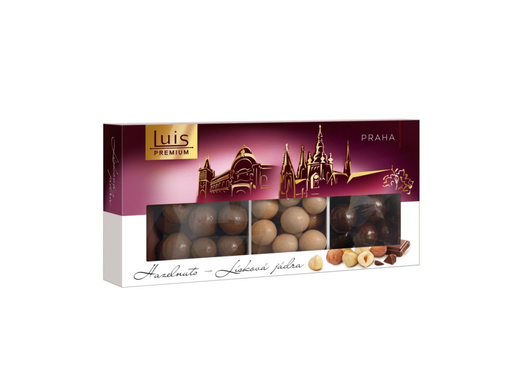 Složení: LÍSKOVÁ JÁDRA (20%), hořká čokoláda 79% (cukr, kakaová hmota, kakaové máslo, rostlinné tuky (palmový olej, olej z máslovníku), MLÉČNÝ TUK, emulgátory: lecitiny a polyglycerylpolyricinoleát, přírodní vanilkové aroma, sušené MLÉKO), leštící směs (tapiokový škrob, cukr, leštící látka: šelak). Mléčná čokoláda 79% (cukr, kakaová hmota, kakaové máslo, rostlinné tuky (palmový olej, olej z máslovníku), MLÉČNÝ TUK, emulgátory: lecitiny a polyglycerylpolyricinoleát, přírodní vanilkové aroma, sušené MLÉKO), leštící směs (tapiokový škrob, cukr, leštící látka: šelak. Bílá čokoláda s karamelem 66 % [cukr, kakaové máslo, sušené MLÉKO, karamelový prášek 10,5 % (sušené MLÉKO, sušená SYROVÁTKA, cukr, MLÉČNÝ TUK, přírodní vanilkové aroma), karamelizovaný cukr 1,5 %, emulgátor: lecitiny; kakaová hmota, sůl], lešticí směs (tapiokový škrob, cukr, lešticí látka: šelak)
